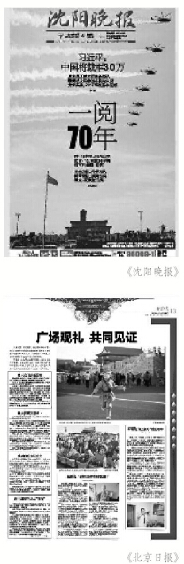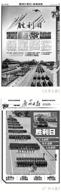 9月4日的《人民日报》出版了8个版的《阅兵特刊》,分为铭记、荣光、和平、礼赞、捍卫、足迹6个篇章。“铭记篇”刊登了评论文章《胜利属于正义和平 胜利属于人民》;“荣光篇”刊发文章《一个有希望的民族不能没有英雄》,为老兵喝彩;“捍卫篇”的《金戈铁马,守护和平》报道,以阅兵式上的武器为线索,详解我军参加阅兵的武器装备;此外,“和平篇”聚焦了阅兵式上的外军方队与代表队。《人民日报》在头版还通栏刊发阅兵分列式全景大图,极具冲击力。《光明日报》以前4个要闻版,后7个版的《胜利日特刊》铭记历史,缅怀先烈。《经济日报》16个版全部与阅兵活动有关,除前8个版的要闻和广告外,后8个版为《胜利日庆祝特刊》。《解放军报》用36个版面的《阅兵专号》,详解阅兵队伍,剖析阅兵方阵,介绍国之利器。