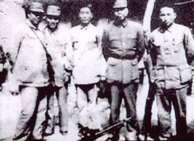 在台儿庄战役中,范长江(右一)、陆诒(右四)与关麟征军长(右二)合影。