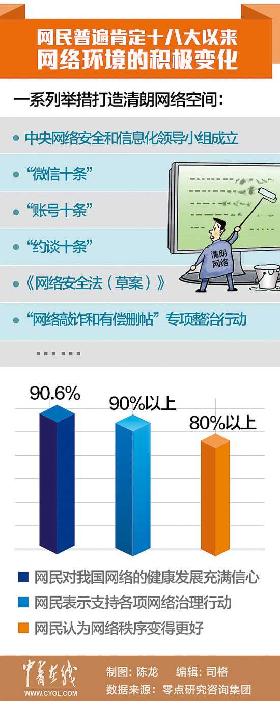 感受自在人心。零点研究咨询集团今年发布的一项调研报告显示,80%以上的网民认为网络秩序变得更好、网络舆论环境得到改善;90%以上的网民表示支持政府发起的各项网络治理行动。