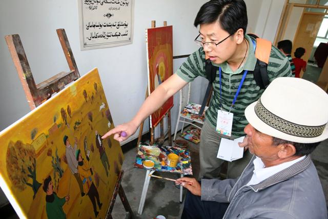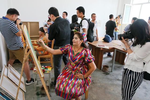 中央新闻采访团在阿瓦提县文化馆采访农民画画家 新疆经济报高原玲子 摄
