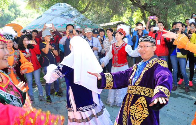 在位于天山天池景区的哈萨克民族风情园,广东电视台记者(右一)身穿哈萨克族服饰与当地群众一起跳起了民间舞蹈 新疆日报阿扎提 摄
