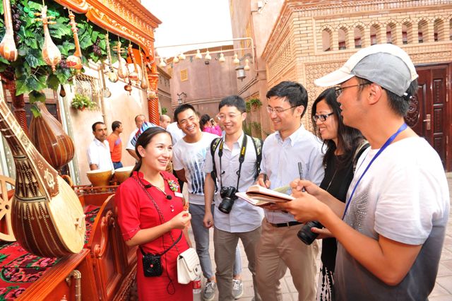 喀什市旅游局工作人员在喀什老城区向中央新闻采访团介绍老城区改造情况以及民族工艺品 新疆日报阿扎提 摄