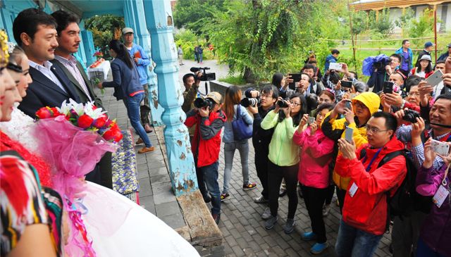 中央新闻采访团在伊宁市喀赞其民俗旅游区采访,欣赏民俗婚礼 新疆日报阿扎提 摄
