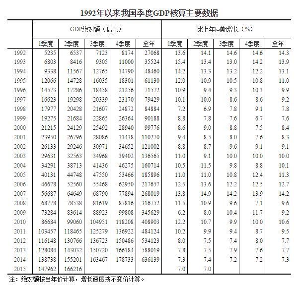 国家统计局对季度GDP数据进行了全面修订,修订后中国2015年一季度GDP同比增长7.0%,二季度GDP也为增长7.0%。