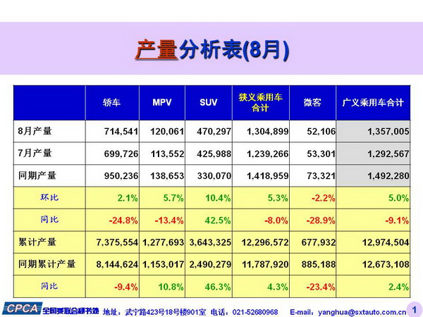 9月10日讯(记者 黄春棉)昨日,全国乘用车市场信息联席会发布2015年8月乘用车销量情况:全国广义乘用车累计销量1,444,249辆,同比增长0.6%。其中,轿车销量794,160辆,同比下降12.7%,依旧延续了疲软的态势;SUV销量458,140辆,同比增长54.6%,继续扮演车市引擎的角色;MPV销量129,690辆,同比下降7.3%。