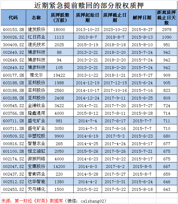第一财经《财商》(微信号:caishang02)发现,自大跌以来,不少公司在紧急赎回质押的股权,在去年七月牛市启动以后才进行的股权质押中,提前三个月以上赎回的股权质押多达105笔,涉及71家上市公司。