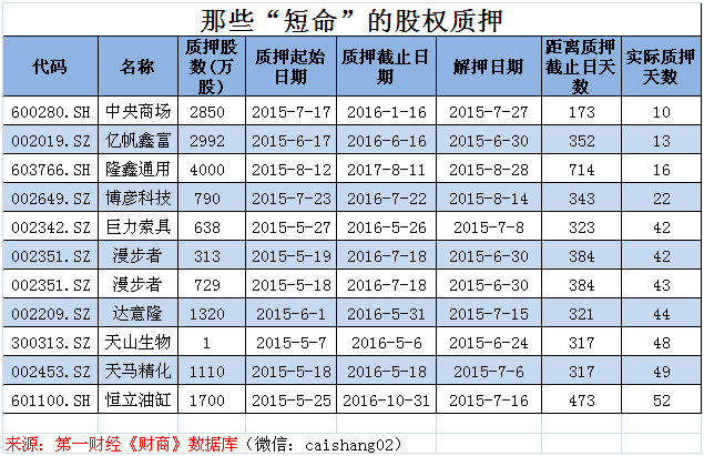 Wind显示,在近期被赎回的质押股票中,包括中央商场(600280.SH)、亿帆鑫富(002019.SZ)、隆鑫通用(603766.SH)等16家公司的22笔股权质押实际质押了不到百天后就被紧急赎回。