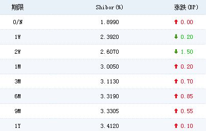另外,今日隔夜Shibor(上海银行间同业拆放利率)报1.8990%,持平上日;7天Shibor报2.3920%,下跌0.20个基点;3个月Shibor报3.1130%,上涨0.70个基点。