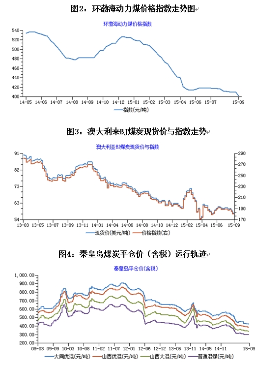 从上述国内动力煤价格与国外煤煤炭价格走势图来看,至2015年9月,煤炭价格走势仍然呈现在下落运行轨迹之中,没有明显的反弹迹象。