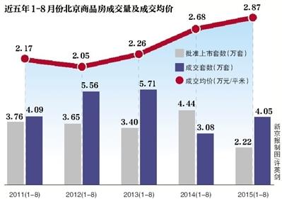 北京市房协的统计数据显示,今年1至8月,全市新建纯商品住宅预售批准上市总量2.22万套(月均2800套),上市量同比减少50%,是近5年中最少的。然而前8月成交量却达到4.05万套(月均5100套),同比增加31%。成交均价更是达到2.87万元/平米,创近5年同期最高水平。