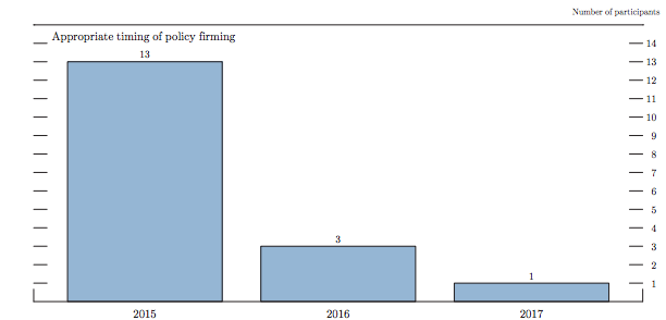 (图说:有13个委员认为应在2015年内加息,3个认为应在2016年加息,仅1个认为应等到2017年再加息。)