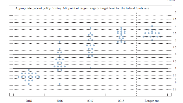 (图说:“点阵图”中的每个点代表了一个委员对于该年利率水平的预测)