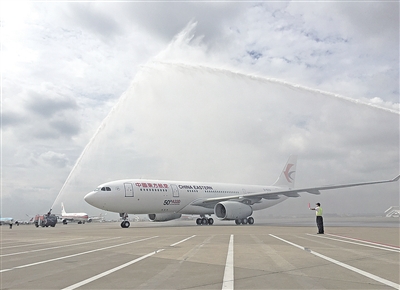 中国东方航空公司第50架空客A330飞机9月19日抵达上海浦东机场。随着国际化进程的加快,东航以上海、北京、西安、昆明为节点,进一步优化航线网络,打造空中丝绸之路。 经济日报记者 李治国摄