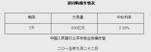 中新网9月22日电 据中国人民银行网站消息,人民银行于本周二(9月22日)以利率招标方式规模为500亿元的逆回购操作。此次逆回购中标利率2.35%,期限7天。