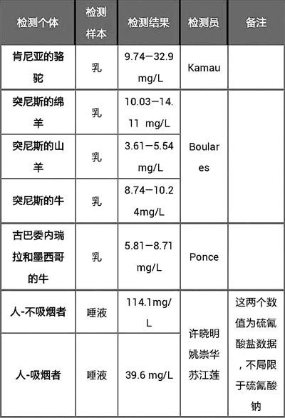 除了饲料之外,奶牛的品种、生活环境、生长阶段、个体差异,都会导致原料乳中硫氰酸盐浓度的差异。不止牛,其实人体中也本来就有硫氰酸钠,我们来看一组数据: