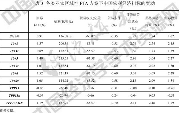 (注:相关资料来源于《经济研究》工作论文《国际经贸规则重构与中国自由贸易区战略》。“10+3”指的是“东盟10国+中日韩”,“10+3x”指的是剔除了中国-东盟自贸区相关影响之外的“10+3”。以此类推。“TPP13”指的是TPP现有12个成员国+韩国,“TPP13CHN”指的是“TPP13+中国”。下同。)