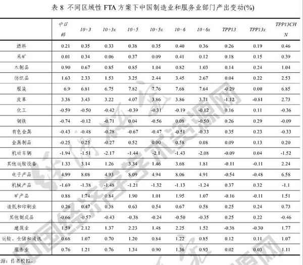 上述结论是张伯伟和彭支伟运用GTAP模型进行模拟计算得出的。他们的模拟结果表明,在贸易和投资开放标准一致的前提下(也即就潜力而言),中国、日本、韩国、马来西亚和越南等东亚及东南亚经济体加入各类亚洲区域FTA,特别是RCEP,可获得接近甚至超过加入TPP的经济收益。这实际上表明,在产业层面,东亚及东南亚经济体在制造业和生产性服务业领域已形成的紧密的区域生产分工体系是这些经济体参与亚太经济一体化所得的主要收益的来源。