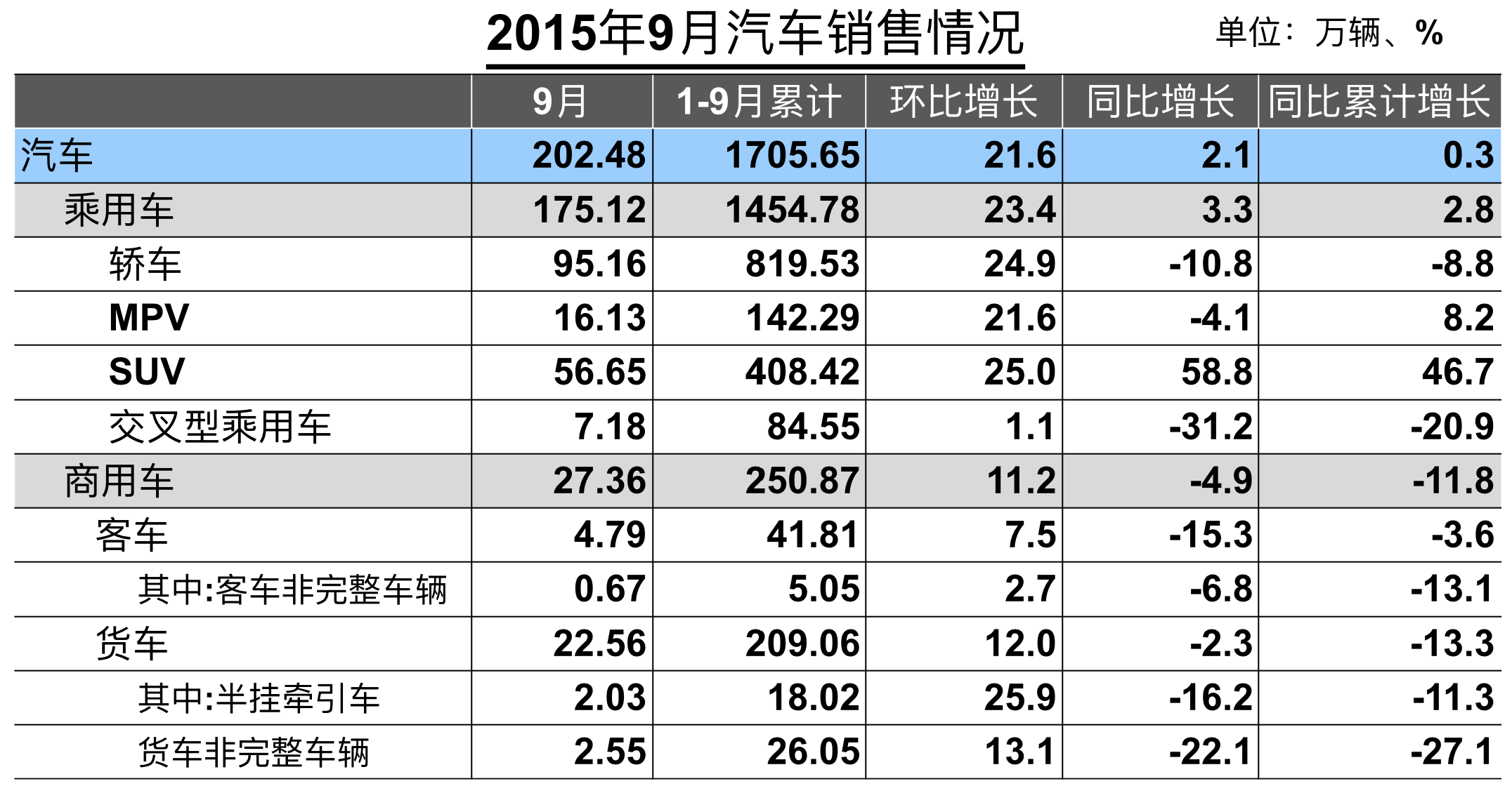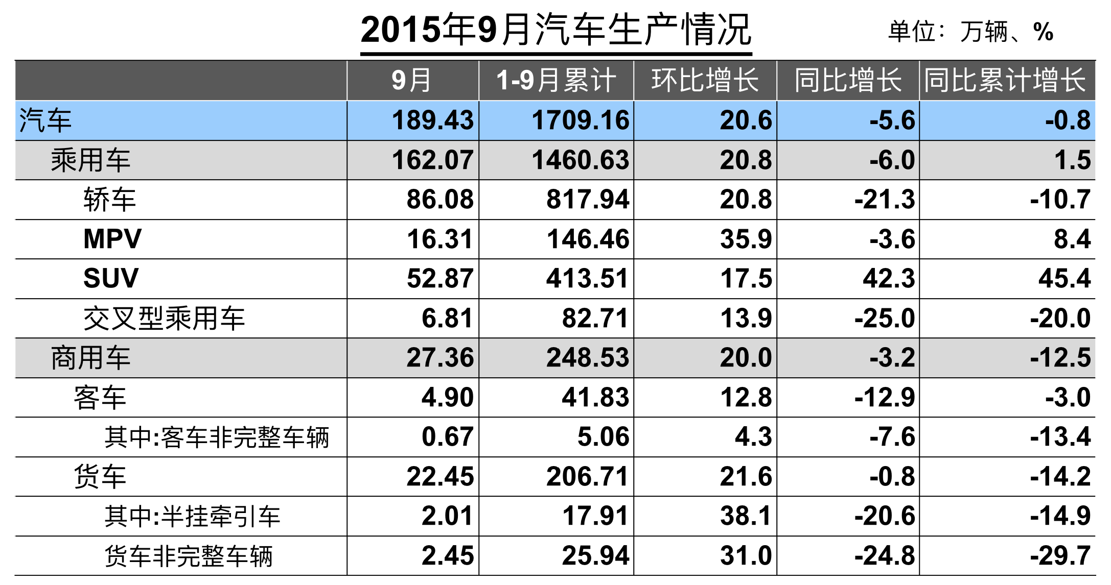 9月,汽车生产189.43万辆,环比增长20.63%,同比下降5.64%,降幅比8月减缓2.80个百分点;销售202.48万辆,自1月、3月后年内销量再次超过200万辆,环比增长21.60%,同比增长2.08%,结束下降趋势。1-9月,汽车产销1709.16万辆和1705.65万辆,产量同比下降0.82%,销量增长0.31%。