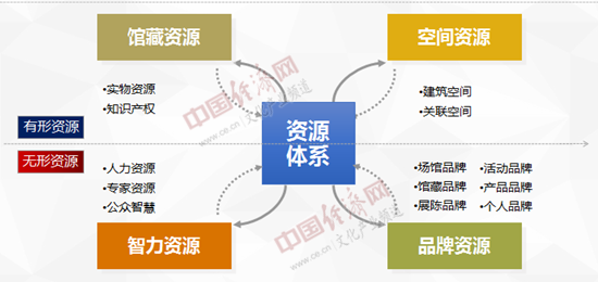 首先,我们对博物馆可用于文化产业开发的资源要素进行系统梳理。博物馆的文化属性、社会属性以及其独特的文化资源使其具有发展文化产业的先天优势和基本条件,除常被理解为“文化资源”的馆藏资源之外,其可支撑文化产业开发的资源要素还包括空间资源、品牌资源、智力资源等三个序列,如下图所示: