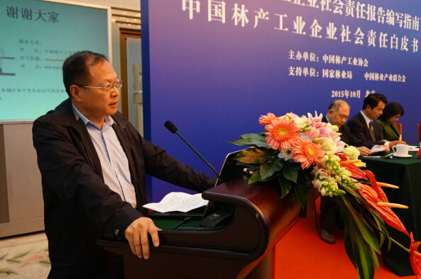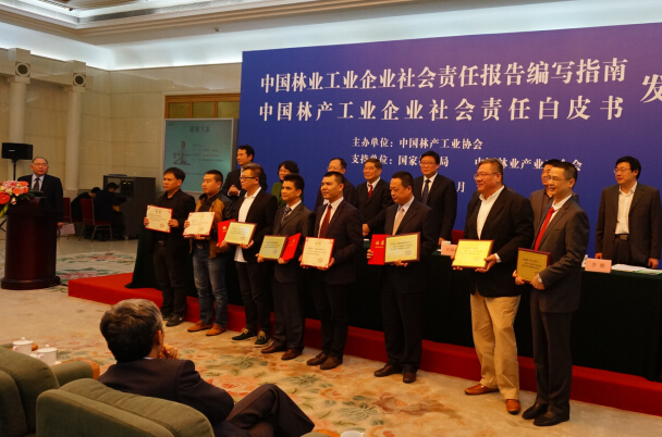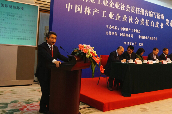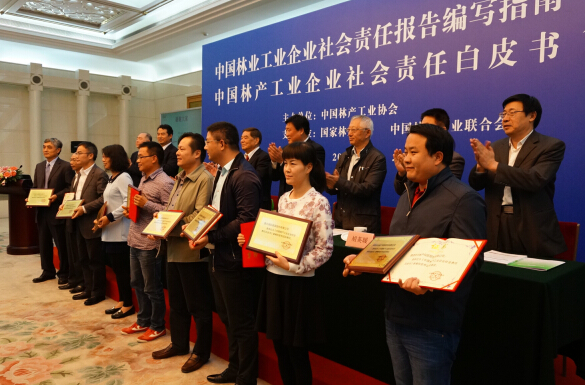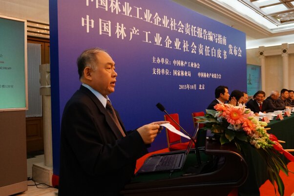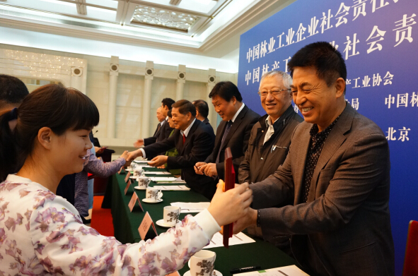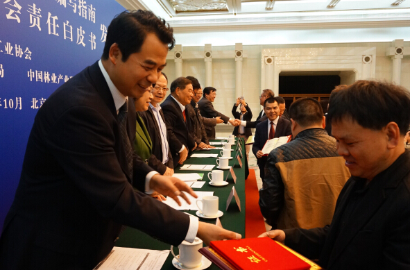 原林业部副部长,中国绿化基金会顾问蔡延松、国家林业局计财司副司长,全国木材行业管理办公室主任孙建、北京林业大学校长宋维明、国家林业局经济研究中心党委书记戴广翠、国家发改委农经司副司长吴晓松、中国林业产业联合会副会长兼秘书长王满、中国经济报刊协会副会长兼秘书长胡英暖、国家林业局林业规划设计院党委书记,副院长李鹏出席发布会,并为《中国林产工业企业社会责任白皮书》参编企业颁发证书。中国林产工业协会秘书长石峰主持会议。