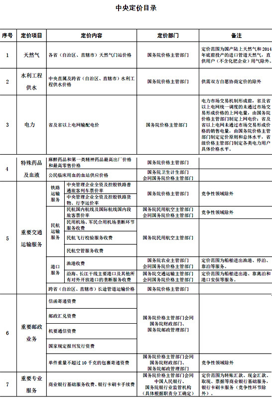 北京10月21日电 据发改委网站消息,今日,国家发展改革委发布重新修订的《中央定价目录》,自2016年1月1日起施行。新修订的目录显示,中央定价范围大幅缩减,仅保留天然气、供水、电力、特殊药品及血液等七项,定价项目减少80%左右。