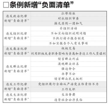 以问题为导向,新修订的条例新增6类“负面清单”,增加拉帮结派、非组织活动等违纪条款(详见下表)。除了“一增”,条例的修订还有“一减”“一整合”。“一减”即删除了原条例中70余条与法律法规重复的规定,代之以党组织和党员必须“模范遵守国家法律法规”,党组织和党员“违反国家法律法规”“都必须受到追究”等专门规定,以实现党纪与国法的既相互分开又有效衔接。