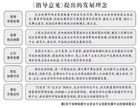 为落实党中央、国务院关于大力推进大众创业万众创新和推动实施“互联网+”行动的有关部署,9月底国务院印发了《关于加快构建大众创业万众创新支撑平台的指导意见》(以下简称《指导意见》),提出在大力发展众创、众包、众扶、众筹(以下统称四众)的过程中,面临行业准入、信用环境、监管机制等问题,将如何加快构建大众创业万众创新支撑平台、推进四众持续健康发展的意见。