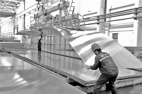 图为中铝西南铝生产的全铝运煤车用铝合金预拉伸板。 李 影摄