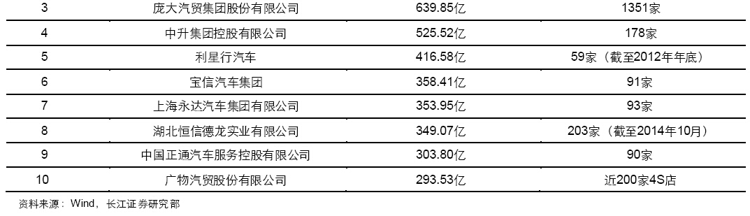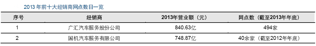 《品牌授权管理办法》决定整车企业完全主导汽车产业链,汽车养护及维修也不例外,整车厂控制的4S店成为核心渠道。根据中国汽车流通协会的数据,截至2013年年底,我国4S店数目达22518家。2013年前十大经销商中,网点数目最多的达1351家,网点数目最少的也有59家,汽车维修业务已经成为经销商重要的利润来源。