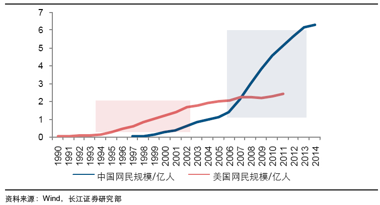 互联网技术诞生于1969年美国,真正普及是从1990年开始,目前美国互联网普及率已经80%+。从模仿美国开始,中国1994年引入互联网,前10年自由竞争,急速膨胀,后10年逐步转向寡头垄断,产生了阿里、腾讯和百度三大BAT巨头。从网民数量看,2000年后中国爆发式增长,增速远大于历史上美国的增速。从影响程度看,传统各行各业都开始受互联网的颠覆。