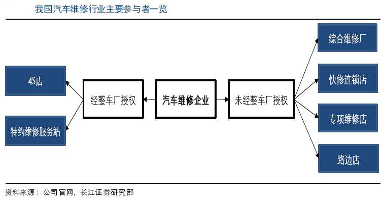 我国汽车维修行业主要参与者包括4S店、特约维修服务站、综合维修厂、快修连锁店、专项维修店,以及大量的路边店。全国一二三类注册维修企业40多万家,从业人员近500万人。