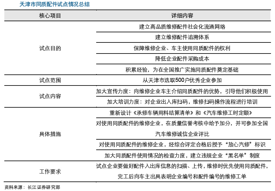 同质配件目前政策上已经给出了明确的官方定义,且明确说明了车主和维修店可以使用,天津市目前试点工作正在有序进行。2015年8月26日,交通部发布关于修改《机动车维修管理规定》中第一次给出了官方的同质配件的定义:同质配件是指产品质量等同或者高于装车零部件标准要求,且具有良好装车性能的配件。而且明确提出:托修方、维修经营者可以使用同质配件维修机动车。从2015年3月开始,天津是作为同质配件第一个试点城市,目前已经正在有序进行。关于本次试点目的、范围、内容、具体措施和要求总结成如下表。