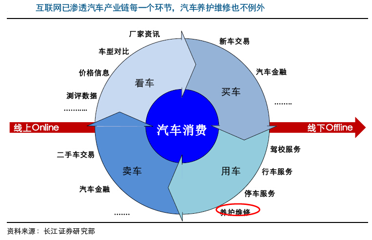 (2)从看车-买车-用车-卖车,汽车消费每一环节已经受到互联网的影响,养护维修也不例外,而且用车环节的渗透强度更深。