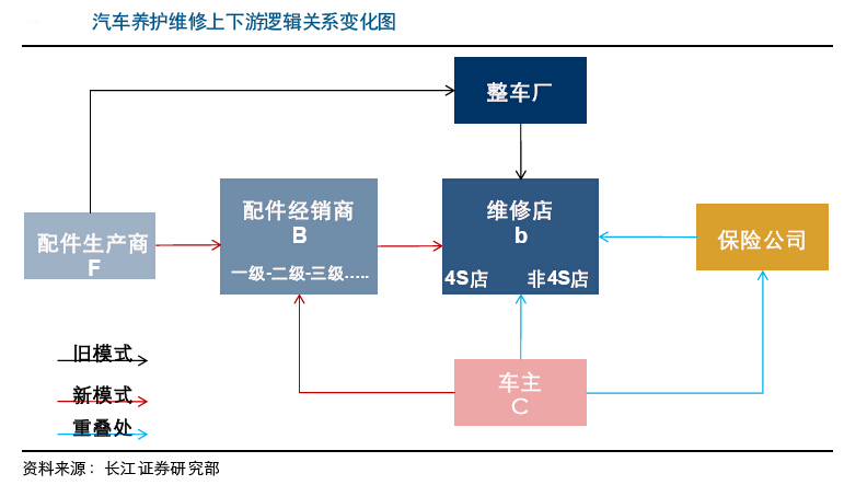 带来的逻辑关系变化:1)原有模式:配件生产商将配件直接配套销售给整车厂,贴上整车厂的商标,然后直接销售给4S店,4S店再销售给终端车主。在这期间同样的产品配件经销商不能生产同等产品投放售后市场,且4S店不能从非主机厂渠道采购配件产品,必须均使用整车厂渠道的原厂件。出发点在于汽车的安全性与责任归属问题,配件的采购与使用必须经过主机厂的同意。2)未来模式:除了以上模式之外,配件生产商可以生产相同质量和用途的配件,贴上自己的商标,直接投放售后市场,4S店与非4S店均可以自主采购。这其中生产商生产出来的配件质量检验和认证需要第三方来评价认证,定义为“同质配件”。当然车主也可以通过电商平台直接从经销商或生产商那采购配件,并不一定需要去4S店与非4S店。而且保险公司在定损时,也不一定只认可原厂件,同质配件也可以使用。