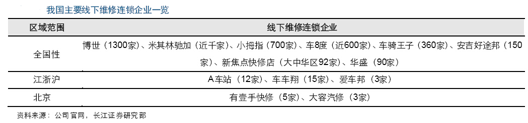 受整车企业控制,正品备件流通不畅、维修技术信息不公开等限制了独立维修企业发展。但是独立维修店相比4S店具有性价比高、服务便利等突出优势,随着维修技术信息的公开和同质配件的推出,独立维修企业的优势将更加明显,未来将有越来越多的消费者选择独立维修企业进行售后服务。当前,我国汽车维修连锁企业尚处于新一轮的跑马圈地阶段,外资如博世、内资如小拇指具备一定规模和优势。