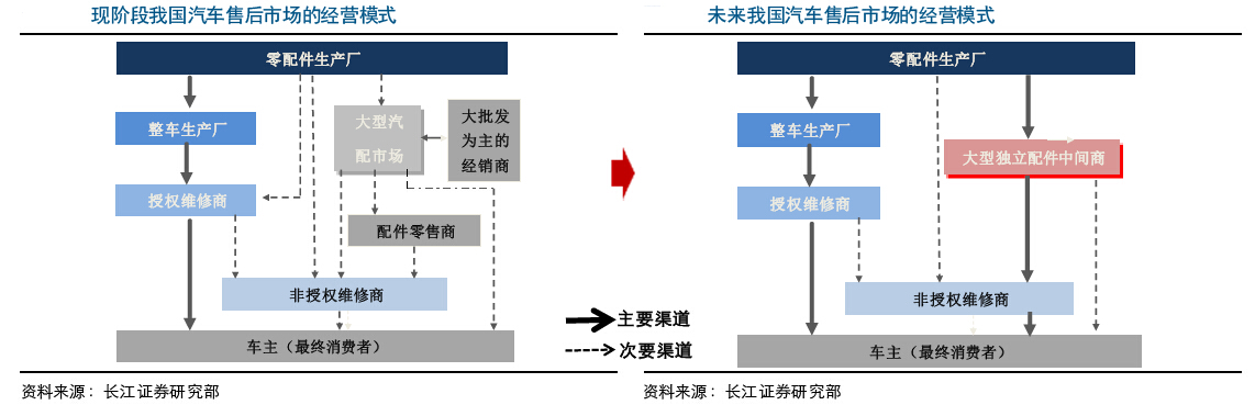 随着经营模式变化,整车厂主导的4S渠道不再一方独大,第三方渠道逐步壮大。随着国家反垄断继续+售后市场政策频出,养护维修市场的经营模式正在开始变化,整车厂主导的4S店模式不再一方独大,第三方渠道逐步壮大!未来修车时,不像以前一样,质保期时只能去整车厂授权规定的维修店维修,且配件价格贵,以后可以去市场上非授权类维修店,以更低价格换到一样品质的部件。因此,未来我国汽车售后市场的模式会有两大渠道并存,4S店话语权降低,第三方独立配件维修商逐步壮大,成为抗衡4S店的主要力量。这也就是类似美国目前的售后“独立”与“非独立”的并存现状。