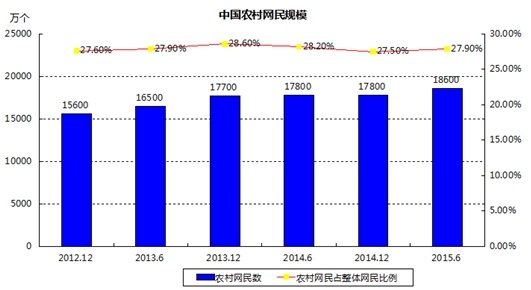 《报告》显示,截至2015年6月,我国网民中农村网民占比为27.9%,规模达1.86亿,相比2012年底增加了3000万。农村地区的互联网普及率为30.1%,比2012年底增长6.4个百分点,这意味着约3个农村居民中就有一个网民。