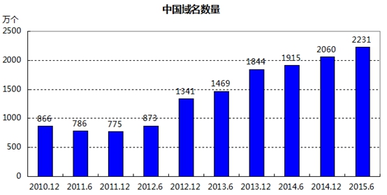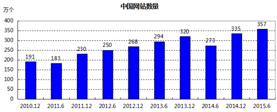 《报告》显示,截至 2015年6月,我国域名总数增至2231万个,相比2010年底大幅增长了157.6个百分点。我国网站总数为357万个,相比2010年底增长86.9个百分点。