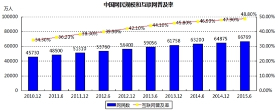 《中国互联网络发展状况统计报告》显示,2010年底至2015年6月,我国网民规模从4.57亿增至6.68亿,共计新增网民2.11亿人。截至2015年6月,互联网普及率攀升至 48.8%,较2010年底提升了14.5个百分点。