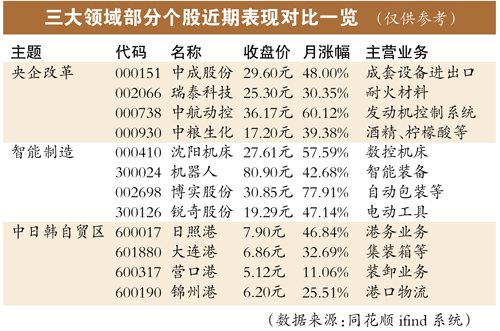 昨日,以“中航系”为代表的央企改革股大面积涨停。国海证券分析师代鹏举认为,近期相关央企下属上市公司密集披露集团与公司改革最新动作,有望重新点燃市场对于国企改革的预期。记者初步统计发现,仅10月份,就有招商地产、同方股份、紫光股份、中航动力、中航动控、中国中铁、国药一致等发布资产整合与重组公告。而中粮集团、国投公司等央企改革试点方案已获国资委批复。另外,北京、上海、山东等多省市正在制定相关细化方案。广发证券分析师陈果也认为,近期方案落地有明显加速趋势,央企与各地方国企动作频频,已经进入国企改革落地期。