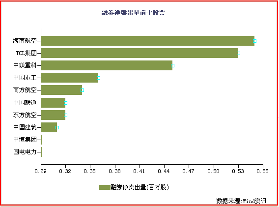 两融市场有买就有卖,10月以来,融券净卖出量排名居前的个股依次为海南航空(600221.SH)、TCL集团(000100.SZ)、中联重科(000157.SZ)、中国重工(601989.SH)、南方航空(600029.SH)等。