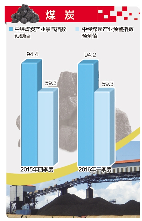 经模型测算,2015年四季度和2016年一季度的中经煤炭产业景气指数分别为94.4和94.2,延续缓慢下降态势;预警指数均为59.3。