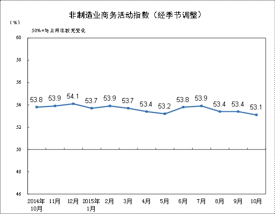 东方财富网讯,2015年10月份,中国非制造业商务活动指数为53.1%,比上月小幅回落0.3个百分点,仍持续位于扩张区间。