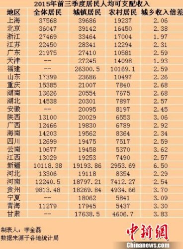 2015年前三季度城乡居民收入。