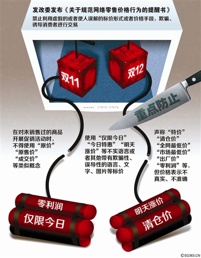 “今日特惠”“明天涨价”等不实语言或者其他带有欺骗性、误导性的语言、文字、图片等,在今年的“双11”电商购物节中不得出现。这是昨天国家发改委价格监督检查与反垄断局发布《关于规范网络零售价格行为的提醒书》(以下简称《提醒书》)明确的。业内人士分析认为,双11来临前夕,针对今年“双11”购物节,主管部门规范网络零售市场价格秩序,旨在保护消费者合法权益。