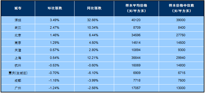 具体而言,48个城市环比上涨,52个城市环比下跌。涨幅居前三位的城市依次是:深圳、惠州、武汉。其中,深圳受高价楼盘入市影响,环比上涨3.49%,居首位;惠州环比上涨3.38%;武汉、东莞、温州、保定涨幅在2%-2.5%之间;合肥、海口、包头、北京涨幅在1.40%-2%之间。