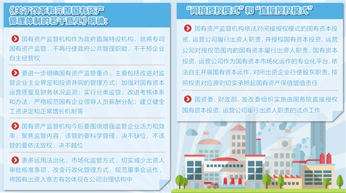 《若干意见》要求,要开展“间接授权模式”和“直接授权模式”的试点工作,积累经验,探索可复制模式,并最终在国有企业中全面推开。国有资产监管机构依法对间接授权模式的国有资本投资、运营公司履行出资人职责,并授权国有资本投资、运营公司对授权范围内的国有资本履行出资人职责。国有资本投资、运营公司作为国有资本市场化运作的专业化平台,依法自主开展国有资本运作,对所出资企业行使股东职责,按照权责对应原则切实承担起国有资产保值增值责任。国资委、财政部、发改委组织实施由国务院直接授权国有资本投资、运营公司履行出资人职责的试点工作。