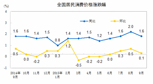 国家统计局数据显示,9月份CPI同比上涨1.6%,涨幅比8月回落0.4个百分点,CPI涨幅重回“1时代”。对于即将公布的10月份CPI,机构普遍预测,由于猪肉等价格出现回落,10月份CPI涨幅或将继续回落到1.5%左右。