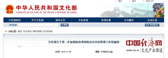 北京11月10日讯 文化部网站9日消息,文化部发布通知,要求网络音乐经营单位按照“谁经营,谁负责”的原则,坚持社会效益和经济效益相统一、社会效益优先,切实履行内容审核主体责任,负责对拟提供的网络音乐进行内容审核,审核通过后方可上线经营。