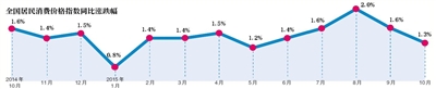 新京报讯 (记者李蕾 沙璐)食品价格回落影响10月CPI。国家统计局11月10日发布数据显示,2015年10月全国居民消费价格指数(CPI)环比下降0.3%,同比上涨1.3%,同比增速再次下滑。分析人士表示,预计未来CPI仍低位运行,全年涨幅约1.4%至1.5%。
